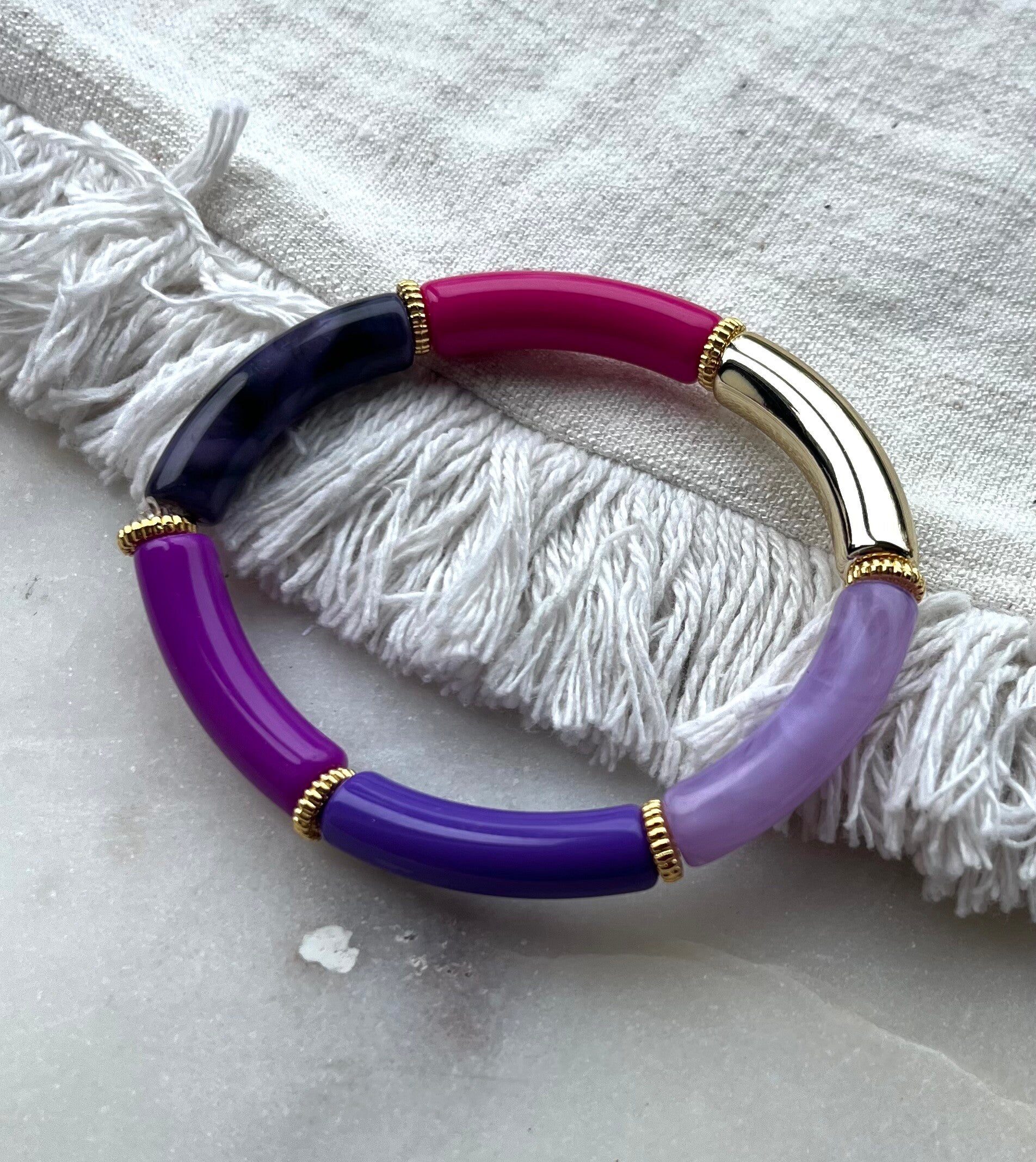 Absoluut het leukste cadeau voor een geliefde of natuurlijk jijzelf. Tube armbandje in de kleuren paars, lila, roze en goud.