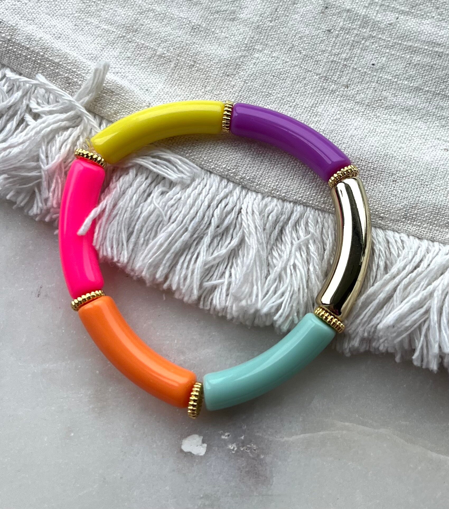 Tube armbanden blauw, oranje, geel, roze, paars en goud.