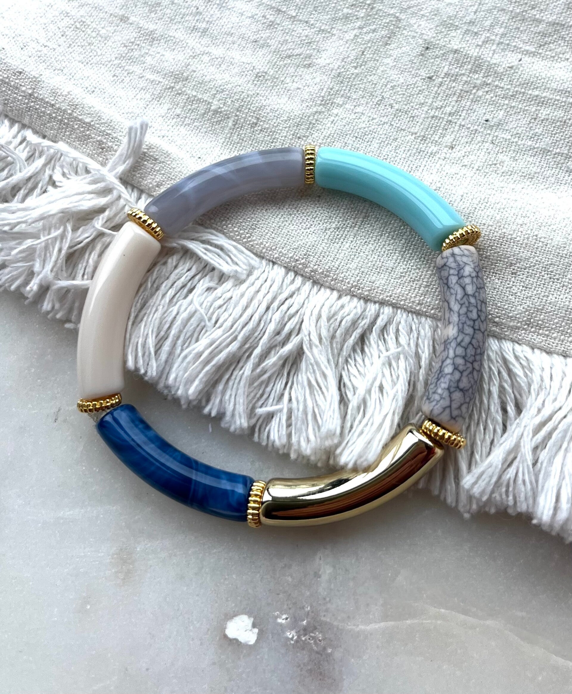 Tube armbanden donkerblauw, lichtblauw, goud en beige,